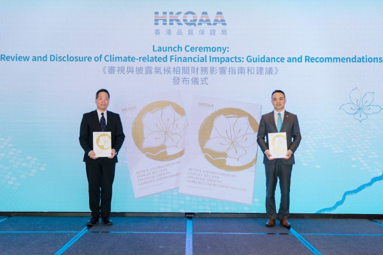 ▲《审视与披露气候相关财务影响指南和建议》的发布仪式:香港品质保证局总裁陈沛昌先生(左)与华润集团办公室(党委办公室、董事会办公室)副主任杨勇先生(右)