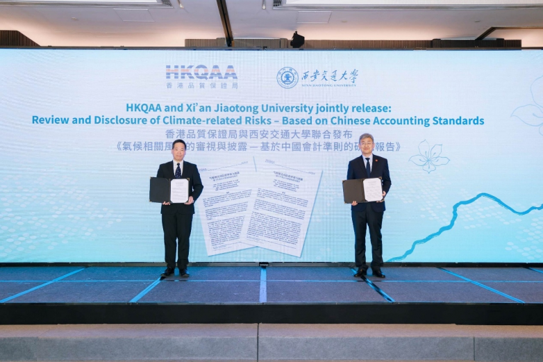 ▲《气候相关风险的审视与披露 —— 基于中国会计准则的研究报告》联合发布仪式:香港品质保证局总裁陈沛昌先生(左)与西安交通大学党委副书记孙早教授(右)
